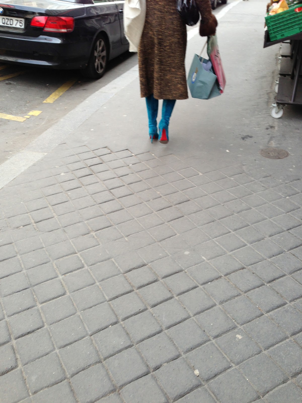 As always, click on the image for a larger version.Note the shoes: Yes, she walking at high speed on the uneven sidewalks of Paris in turquoise suede Louboutin boots with stiletto heels. An amazing--and amazingly expensive--feat.