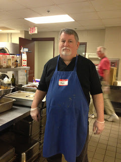 Note the term "guests." Part of the goal is to treat each diner as our guest, from when one of us greets them at the door, to when we serve them food, to when one of us bids them farewell. "Treat each and every person with dignity," the team lead, a woman who's been volunteering there for over thirty years, told our group on Monday. After four days of work, I'm happy to report that everyone I've seen interact with our guests has done just that.