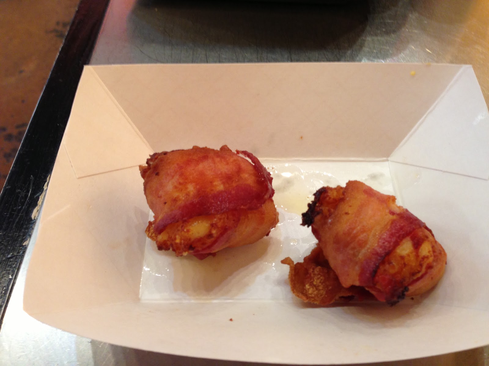 My side dish was equally healthy: the bacon-wrapped macaroni and cheese squares, three to an order (one disappeared down our yaps before I could snap this photo).