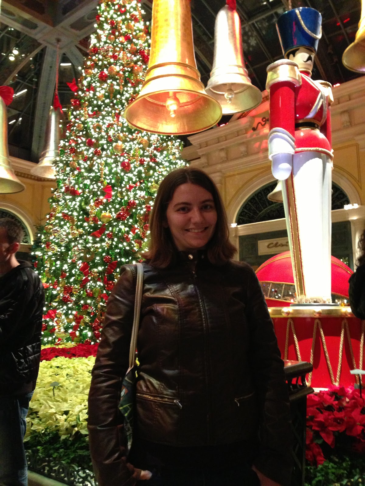 Afterward, we cabbed to the Bellagio for a little sightseeing, dinner at Fix, and dessert gelato. Here's Sarah in front of the hotel's enormous Christmas tree.