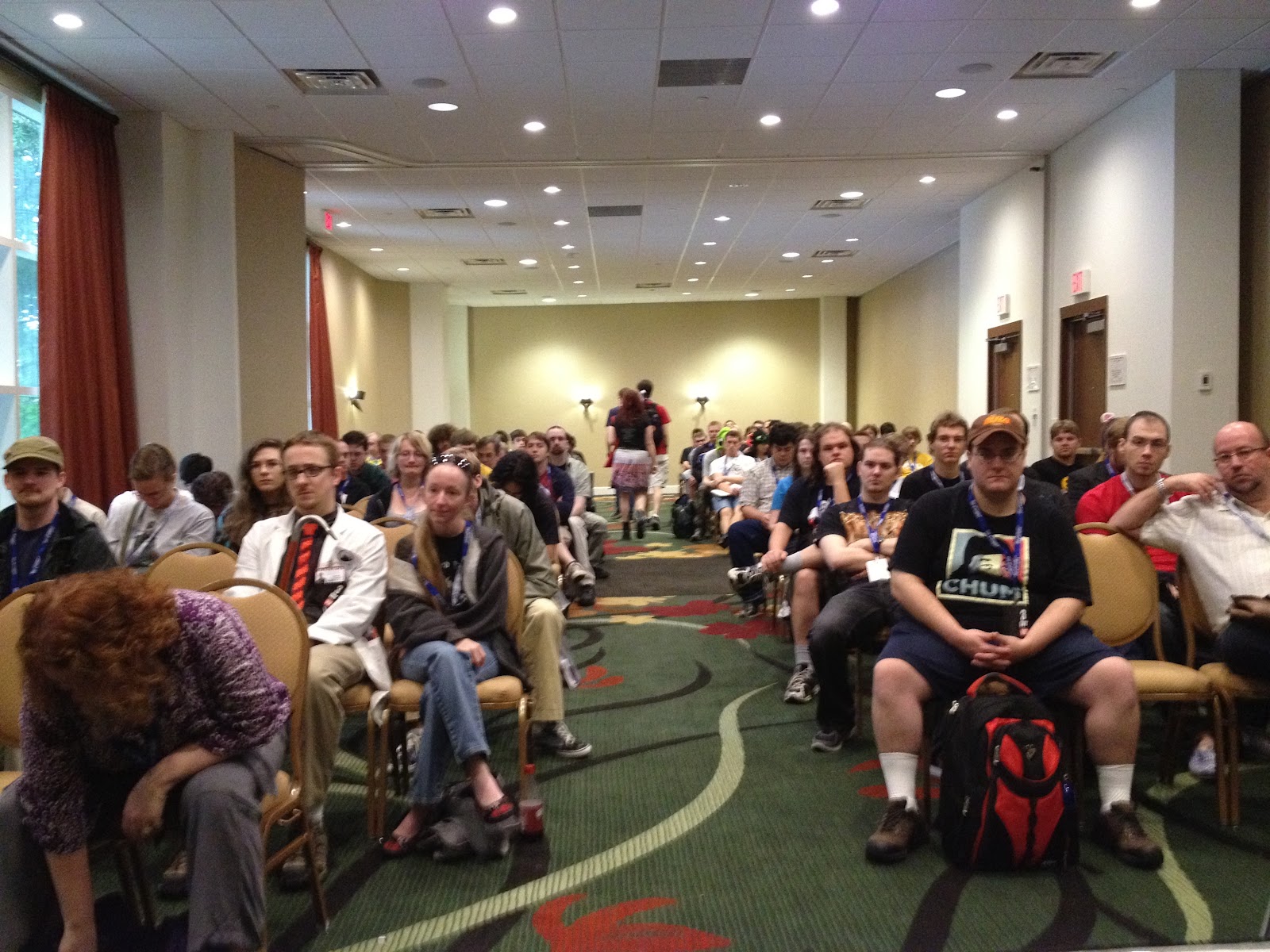 When I arrived at the meeting room about 15 minutes before the panel was due to start, a waiting line had already formed and snaked around the corner from the room. Dave was already there. After Richard arrived a couple minutes later, the con organizers started letting in people.