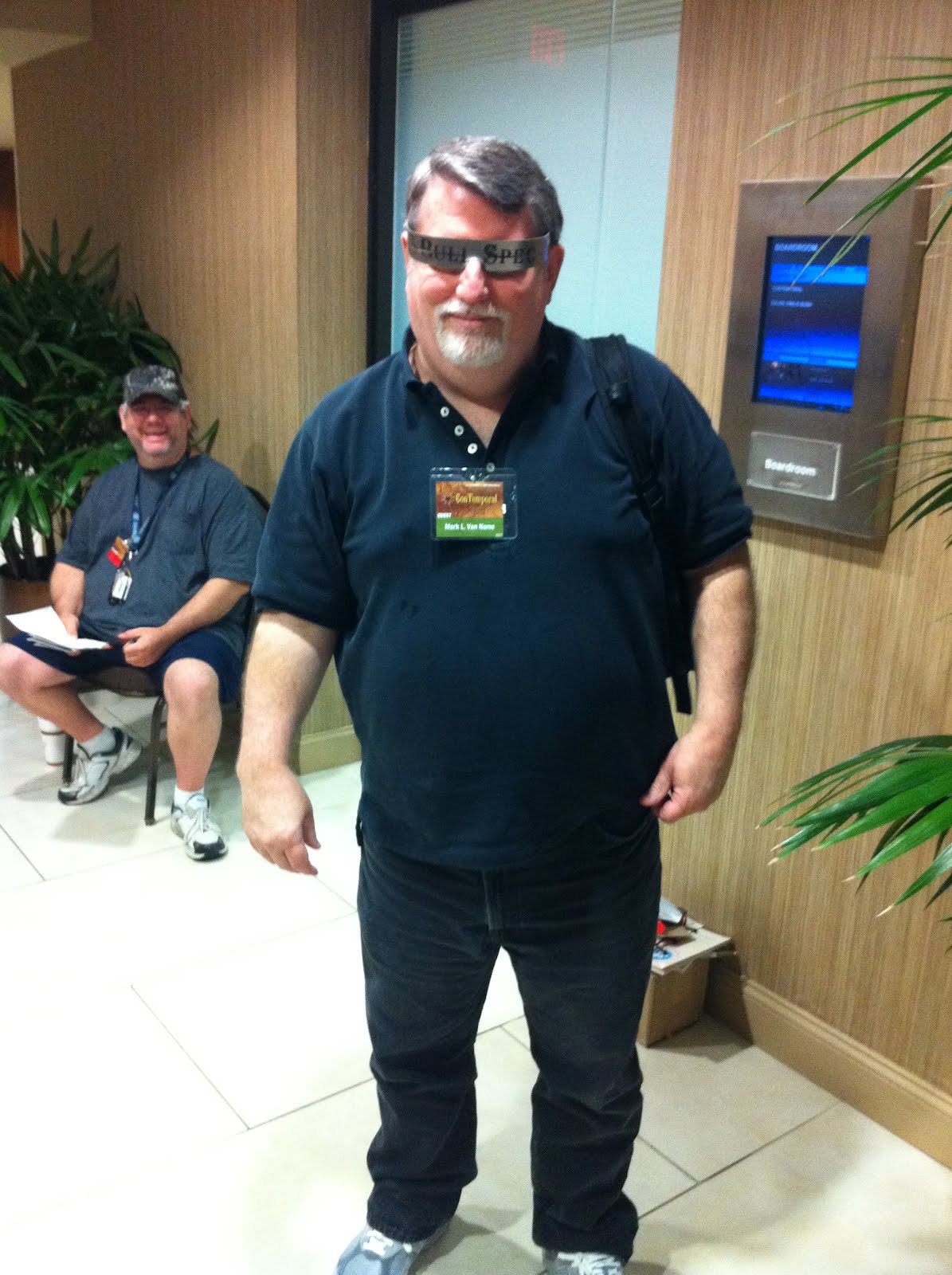 On the way out of the panel, I ran into Sam Montgomery-Blinn, editor of the SF magazine Bull Spec and general advocate of and for the local SF scene. I foolishly posed wearing his odd metal Bull Spec glasses.