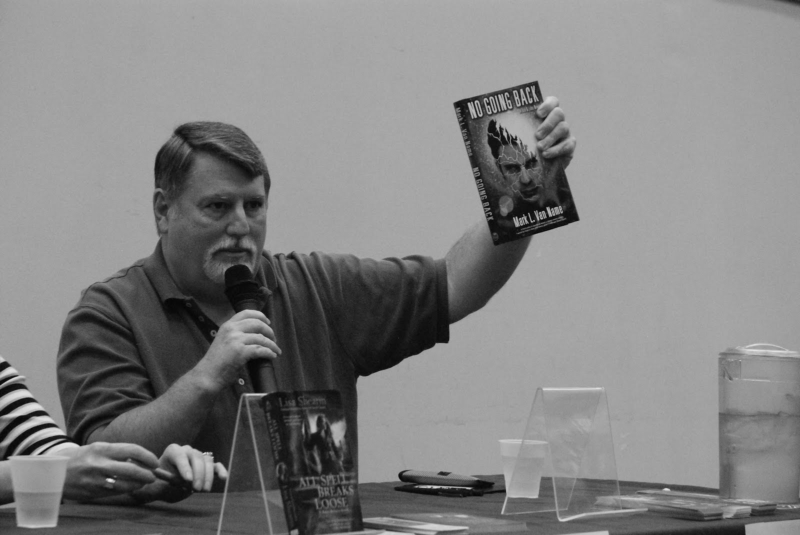 We began by introducing ourselves and our most recent books. Here I am showing off (and flogging) No Going Back, whose lovely John Picacio cover always makes a great first impression.