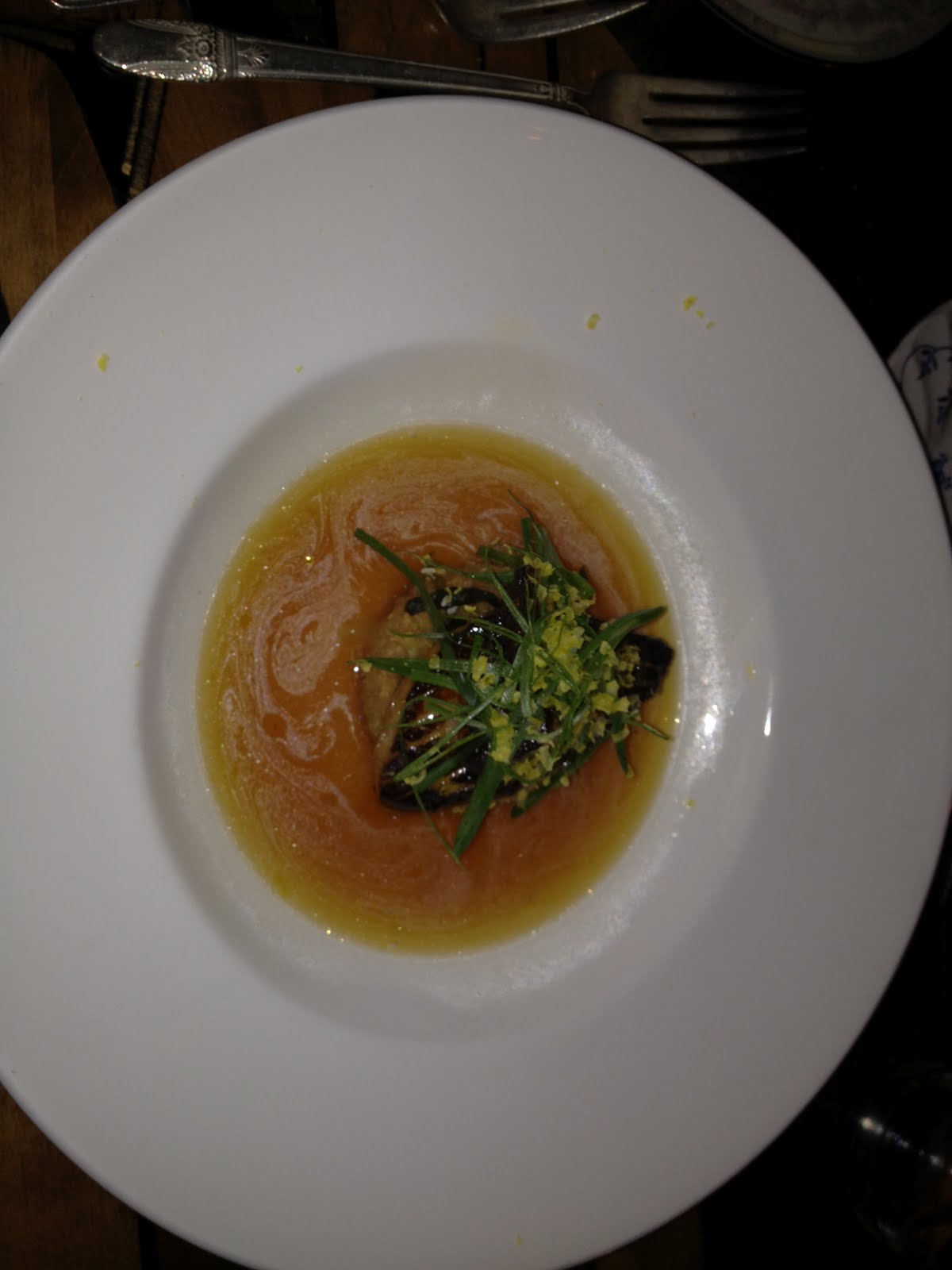 It was an odd combination, of course; this is Le Pigeon. The slab of perfectly cooked foie gras sat atop a cake of ramen noodles that was topped with a seaweed salad and surrounded by a light broth with a very delicate taste of fish. I know, I know: it doesn't sound good. It was.