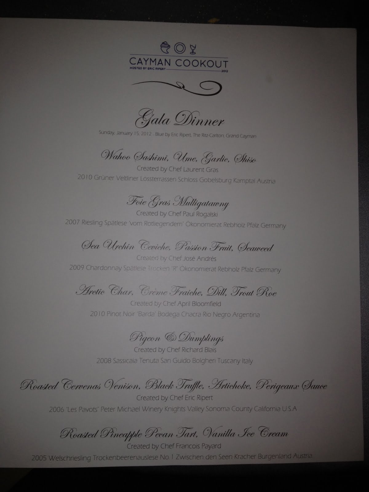 Evening brought the grand finale, the Cayman Cookout Gala Dinner. The meal began with cocktails on the patio outside Blue, but the high winds quickly drove everyone inside. Once we were all seated, seven of the chefs--Ripert, Andrés, Blais, Bloomfield, Gras, Payard, and Rogalski--created a lovely seven-course meal for us. Here's the menu.