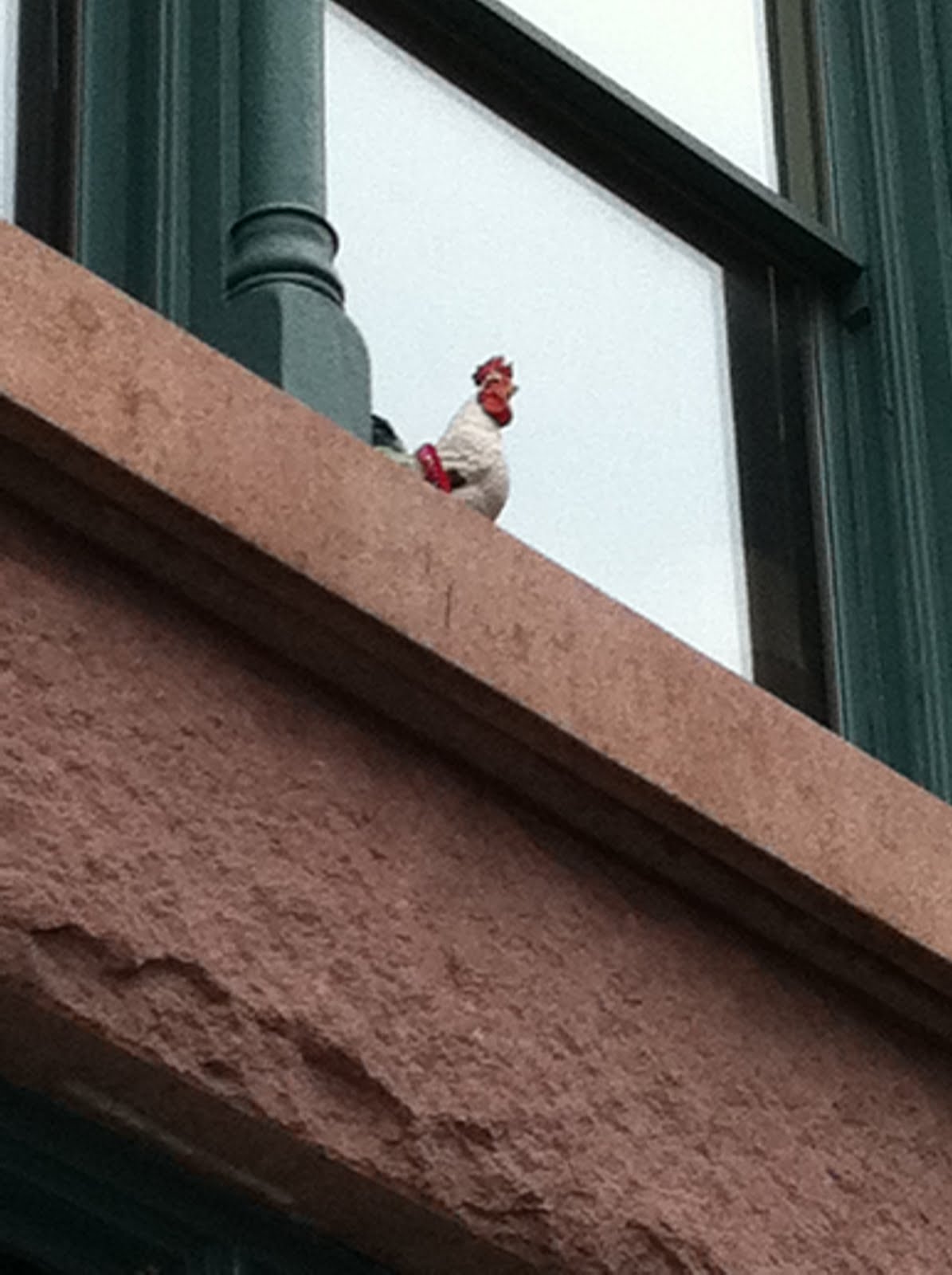 Exiting the restaurant, we spotted this rooster sitting outside a second-story window, the fabled St. Louis guard rooster, standing watch over the mean streets of downtown.