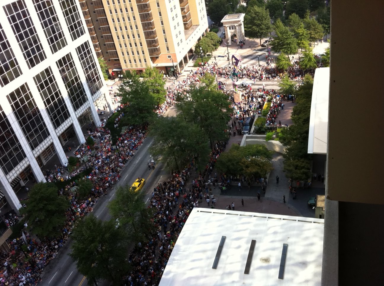 Woke up to the sound of the parade beginning. I'd heard of the Dragon*Con parade before but never really considered it, preferring instead to dismiss it as some small fan thing. Mistake. It is huge, impressive, full of joy, and a ton of fun to watch--which I did, from my hotel room balcony. Using only my iPhone's camera, here's a shot of the crowds lining the part of the route that I could see.