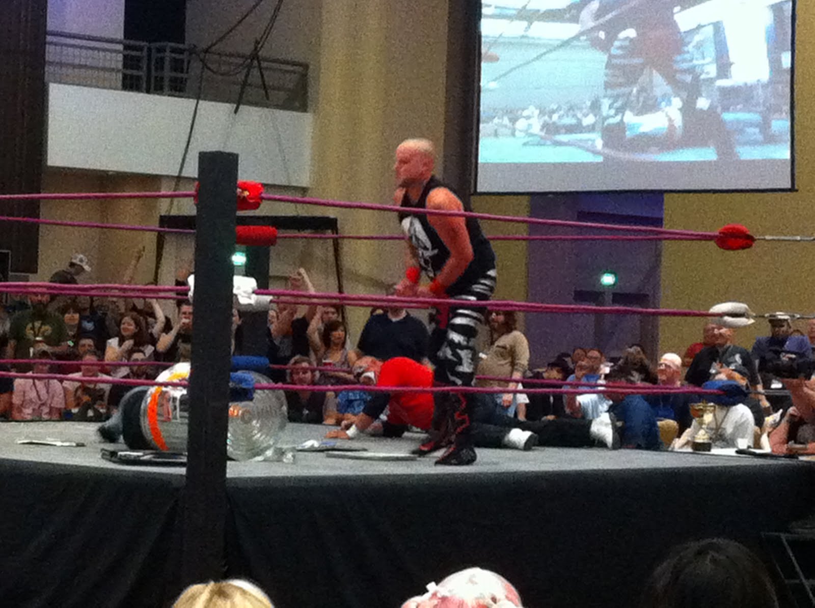 We roamed around quite a bit, talked to some folks, and ended up catching one of the odder events to be at any SF con I've attended: wrestling. I had to share with you a picture of this extreme match, which featured a trash can, a cookie tray, and a broom.