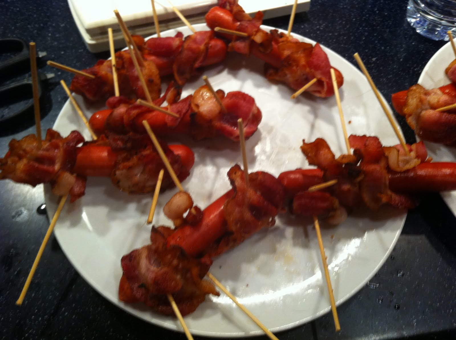 We began, of course, by warming up ten hot dogs, frying a pound of bacon, and wrapping the dogs in the bacon. Rather than going with the recipe's single piece of bacon per dog, however, we turned up the amp and wrapped two pieces of bacon around each tube steak. We didn't have toothpicks, but no such simple deficiency was going to derail this gourmet train, so we cut thin wooden skewers into irregular pseudo-picks. They were big and ugly, but they worked.
