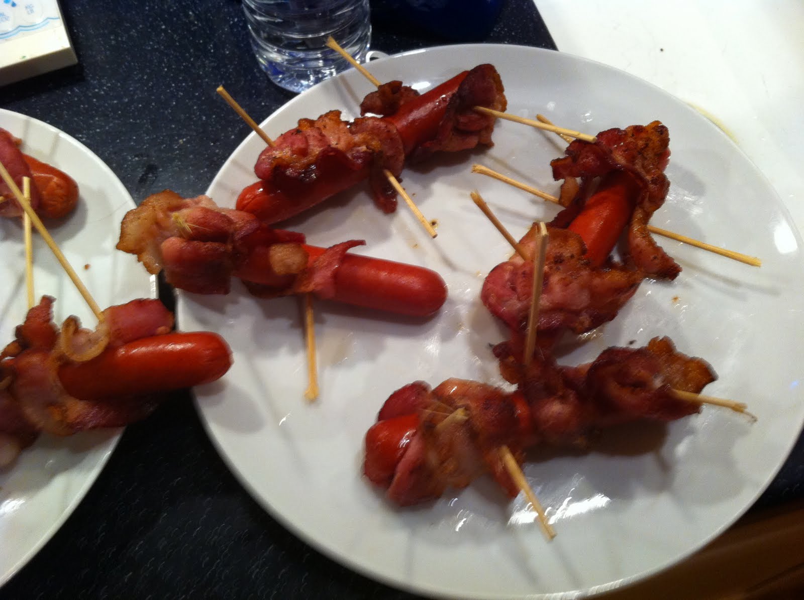 As you can see from these two photos, the result was two plates of bacon-and-dog goodness. Never mind the pieces of wood protruding everywhere at odd angles; we were confident those would somehow turn from merely weird to oddly endearing.