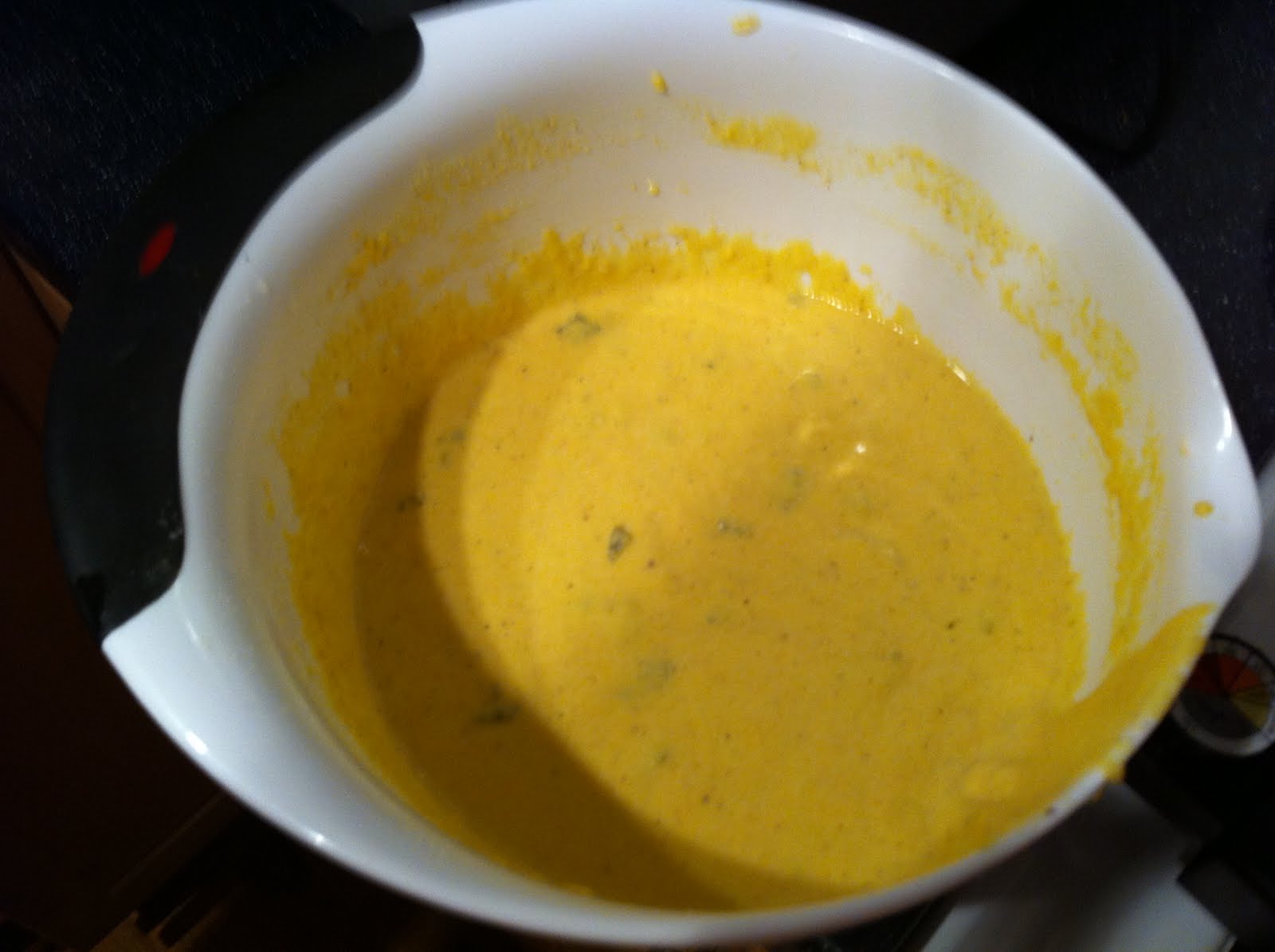 In parallel, we prepared cornmeal batter. Rather than keep the diced peppers (we went for mild jalapenos) separate, however, we mixed them right into the batter. We were nothing if not efficient!