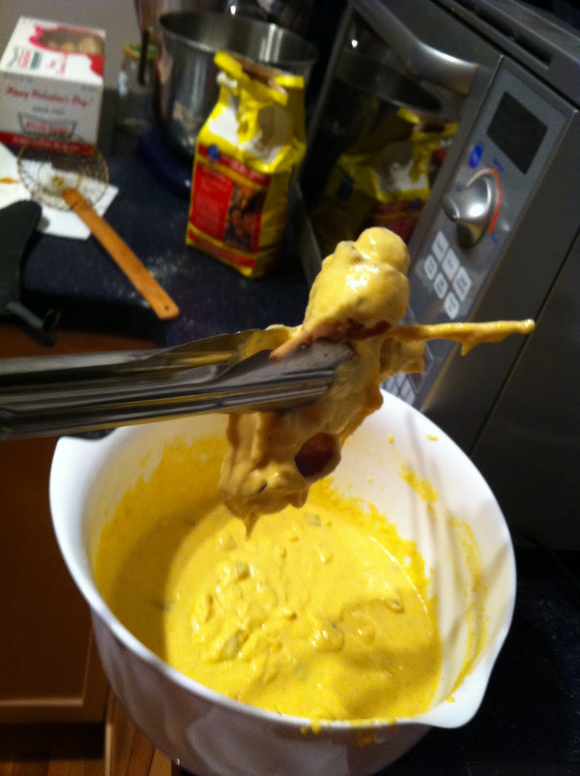 I'm still not sure if the resulting batter looks good or like something the cat left, but appearance alone was not going to deter us! It was time for the dredging!