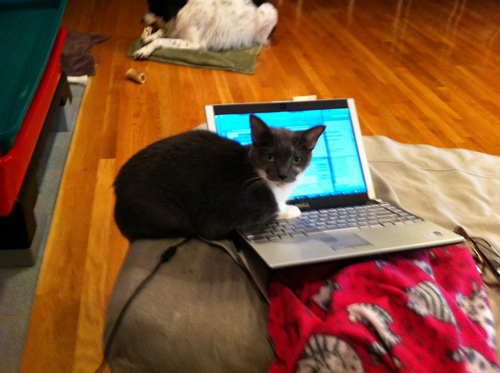 I have more work to do and then must crash so I can get up early for meetings, but for no good reason, I thought you might enjoy a photo of our cat, Lyra, attempting to help with laptop work (fortunately, not mine).