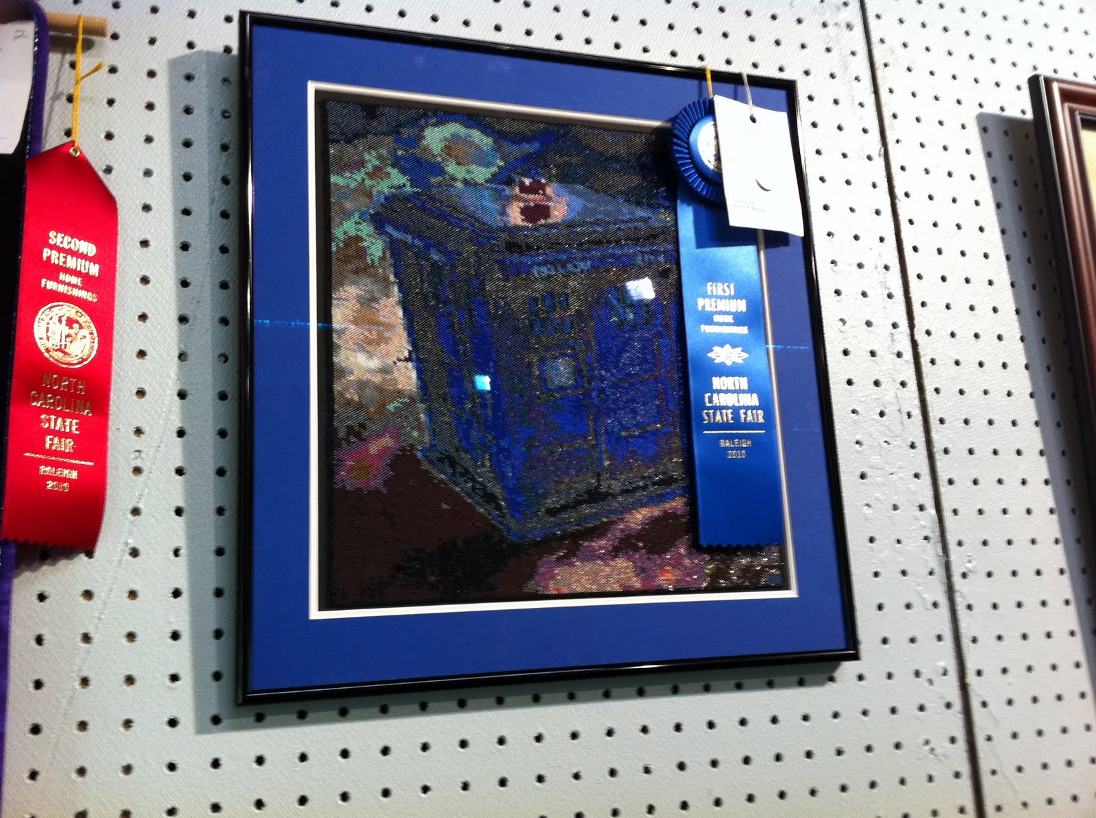 This blue-ribbon-winning beaded TARDIS is the creation of our friend, Merrie, who puts astonishing amounts of time and work into making this unusual art. The picture doesn't do it justice, but we were happy to see her winning this award.