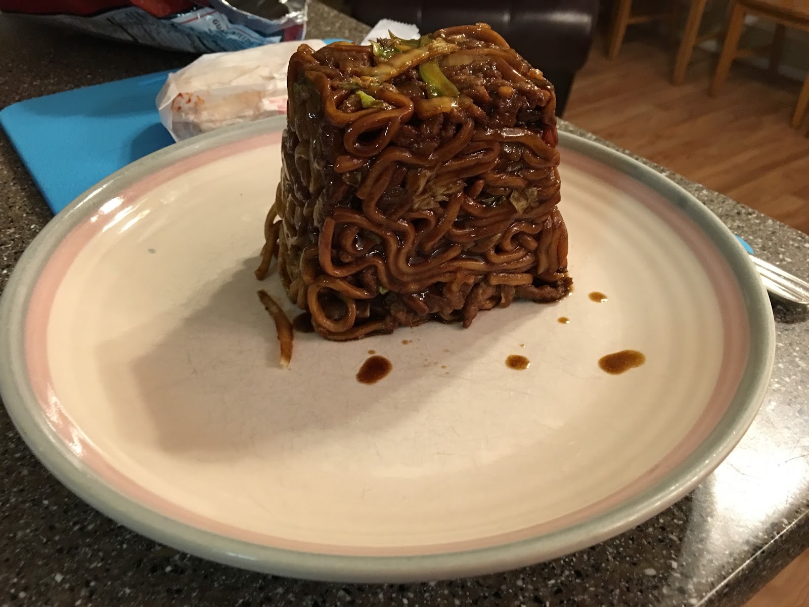 We were not quite as lucky this time; some dishes were fine, but others were not at all good. My beef lo mein arrived in a little box and was sticky enough to retain its shape without the box.