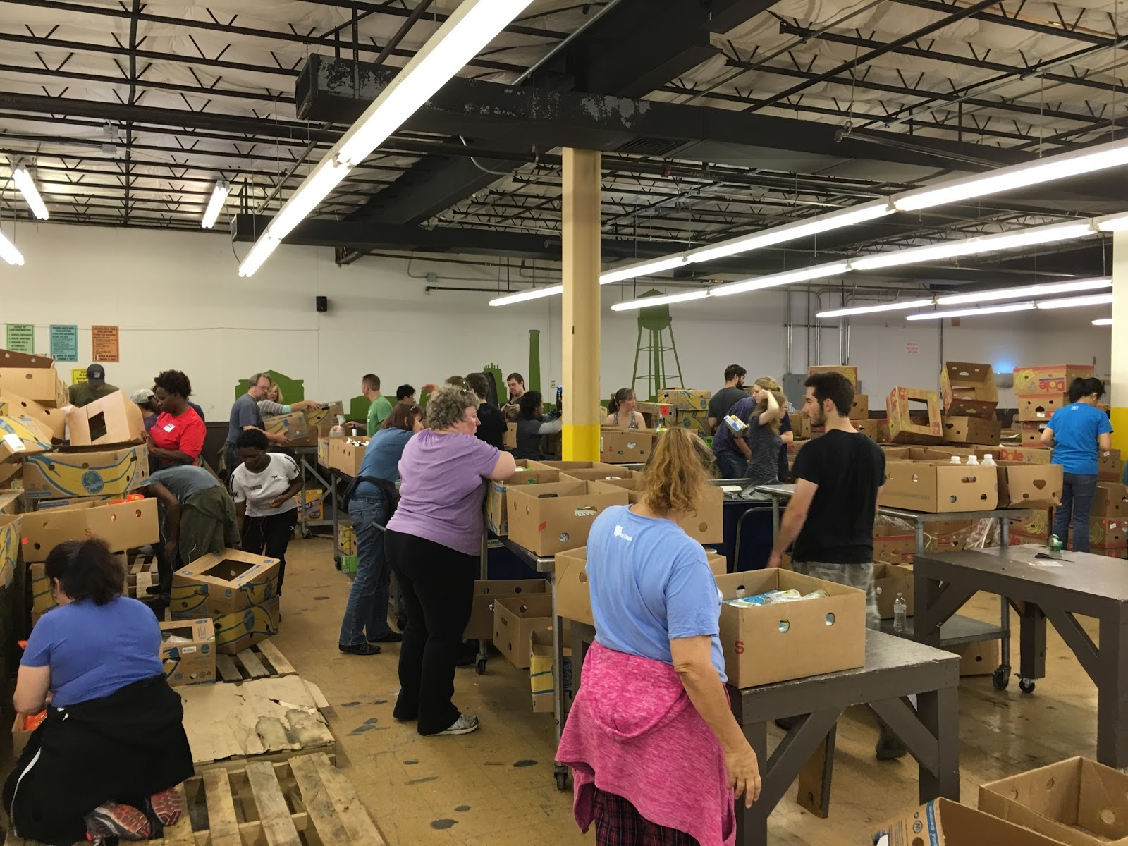 After an hour of standing and listening to two folks train us, we went to work. Our group included some folks from PT, some family members of PT staff, and many more people from other volunteer groups. We collectively numbered over 30. Our job was relatively simple: to convert boxes of donated food into boxes of food sorted by type (e.g., water, other beverages, dry packaged food, and so on).