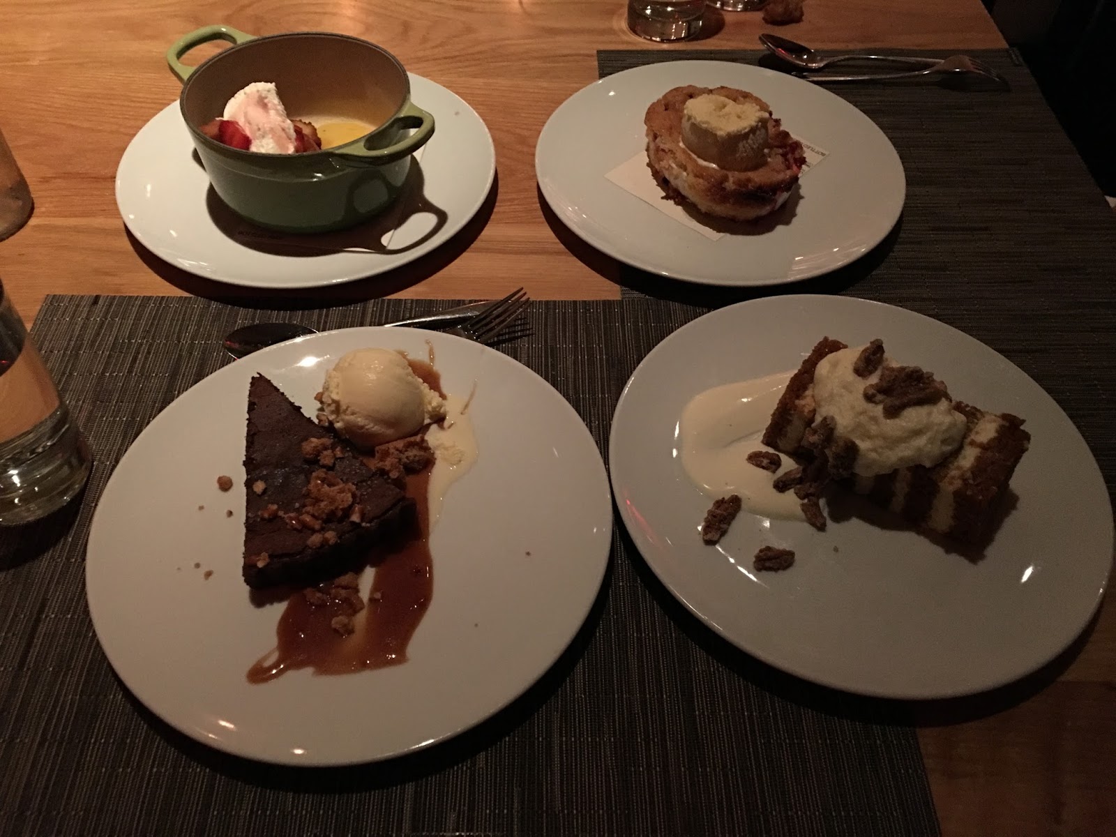 Click the image to see a larger version.From the top left, that's crispy pound cake with strawberries and lemon curd, a wonderful strawberry cobbler with basil ice cream, a chocolate chess pie with bourbon ice cream, and one of the best carrot cakes I've ever tasted.