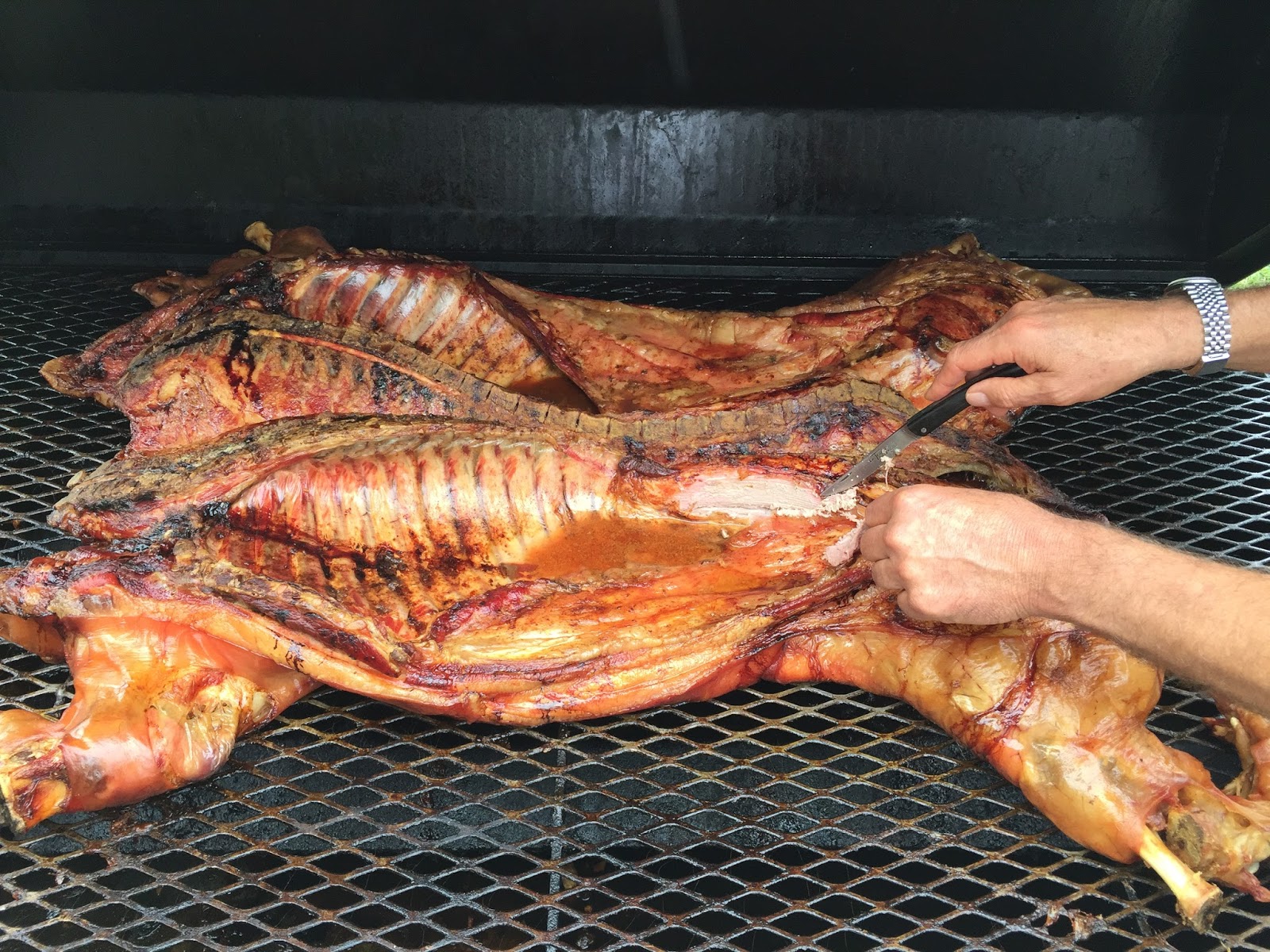 Click an image to see a larger version.I'm talking here about the pig a large group of us enjoyed today at Dave Drake's annual birthday pig-picking. The cut bit in the shot above is where Dave