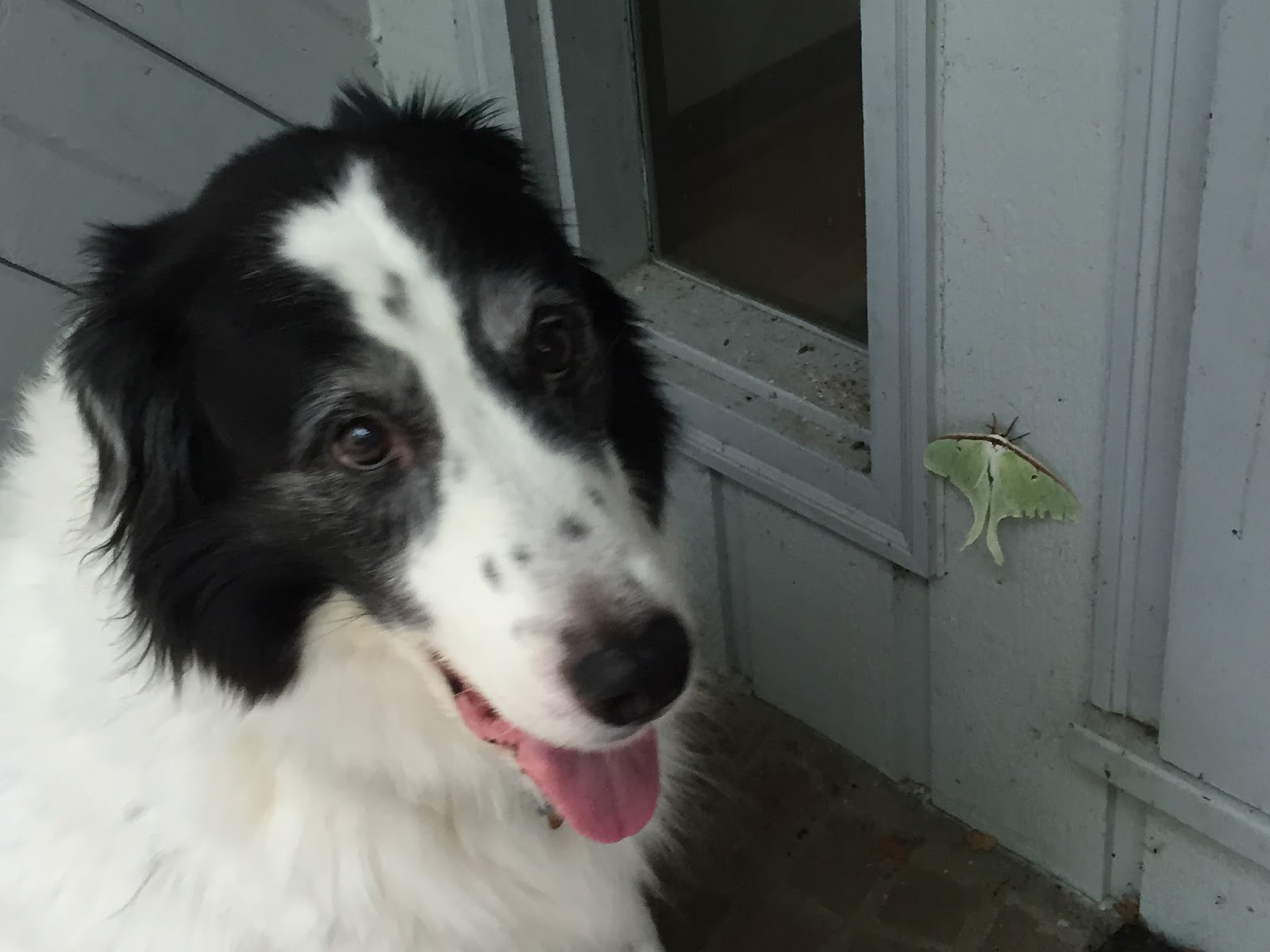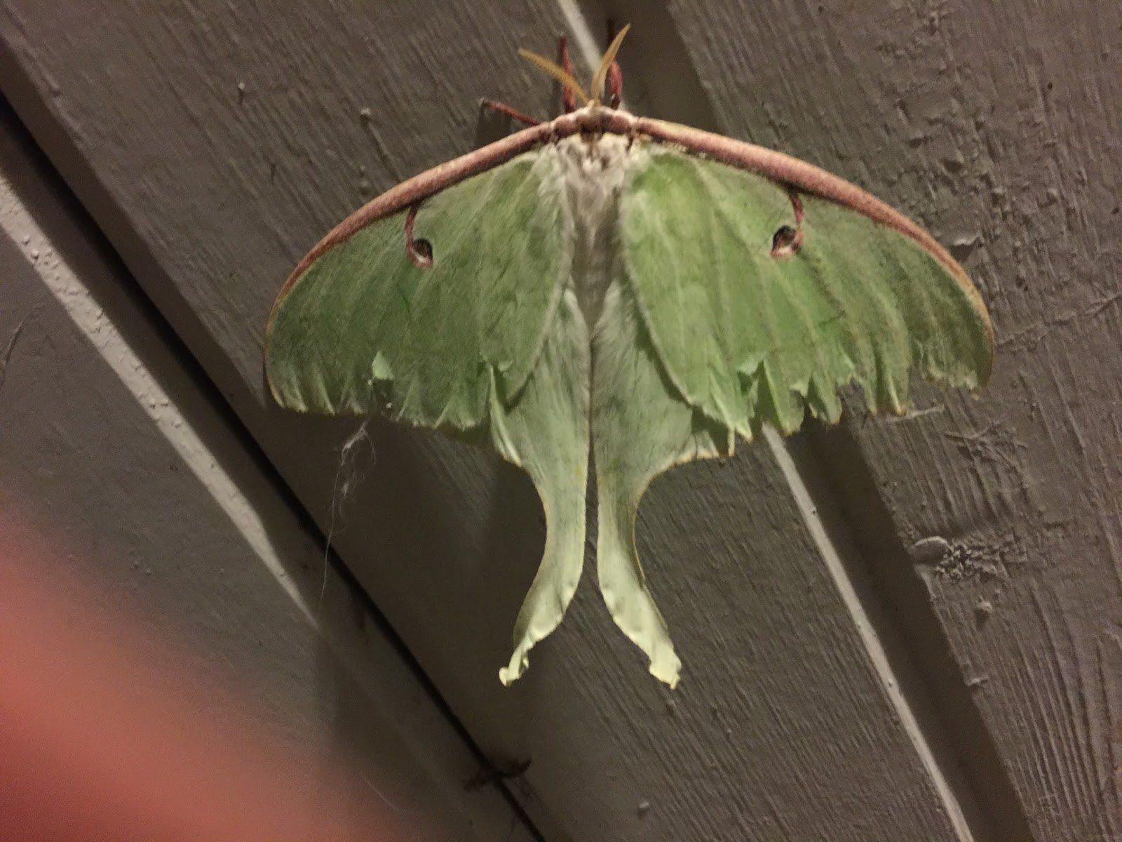 The sounds vanished as I drew closer to the house, where I found this giant yellow moth hanging by the front door.