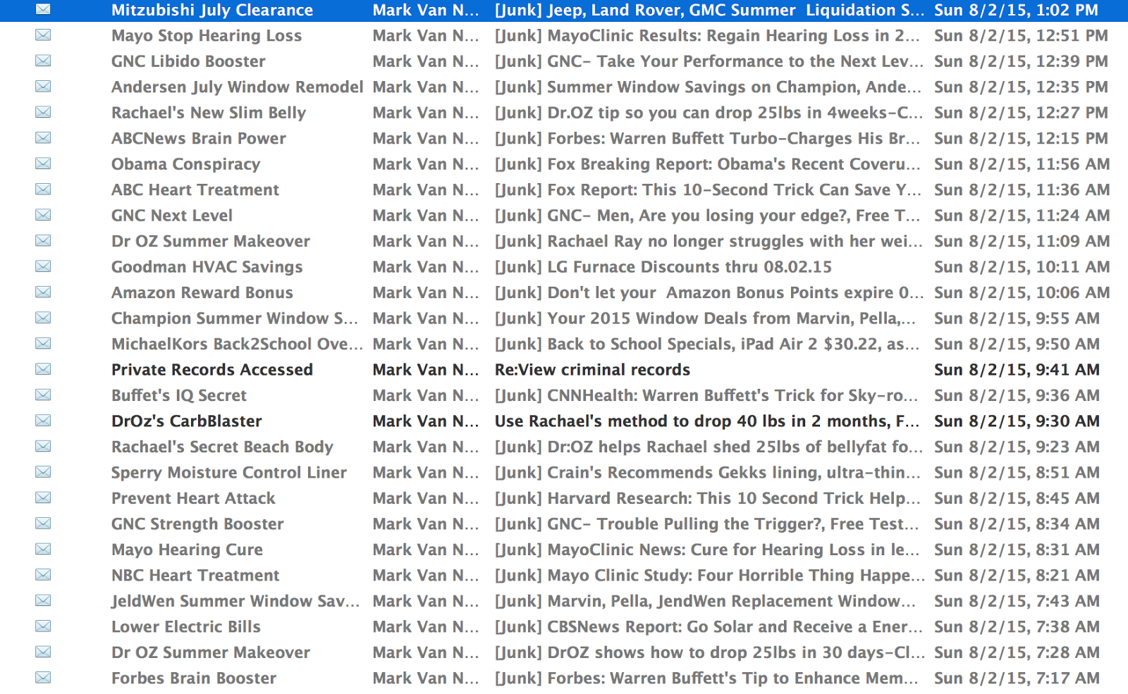 (Click the image to see a larger version.)The good news is that my spam wants to help me get a new car, new windows, new electronics, and some Amazon points.