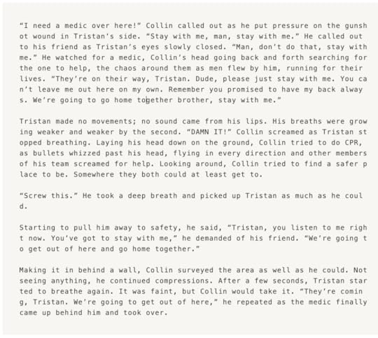 Each of the scenes I’ve written for First to Fight and now for Second to Fall have been through either Collin’s or Kyle’s eyes. Mainly the reader is only seeing, hearing, feeling, and even smelling what my main character is. So I write war scenes from their POV, not everyone else around them, you won’t see the whole huge picture. You’re only seeing/reading what they see or feel. So glimpses are the best way to answer this question for me. You only see the bits and pieces of the whole war, my characters tiny part of it all.