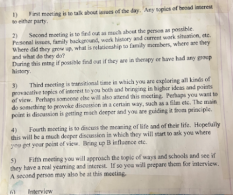 A reader and former member came across the printout from 30 years ago which was given to us by cult leaders describing the recruitment method and the specific 6 meetings we were to have to dupe people into joining the cult. Although there are slight variations being used today (including a phony salon and tea with female leaders and members), this is still the playbook. Im publishing it here so that anyone who is being preyed upon can see the scoop.