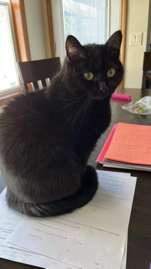 I am surrounded by cats! It’s true. I live with four of them, and there is always one near by. When we got the fourth cat, my son named her Jade. It wasn’t my choice, I promise you. My son thought it would be cute. Here is a picture of Jade ‘helping’ me grade quizzes.