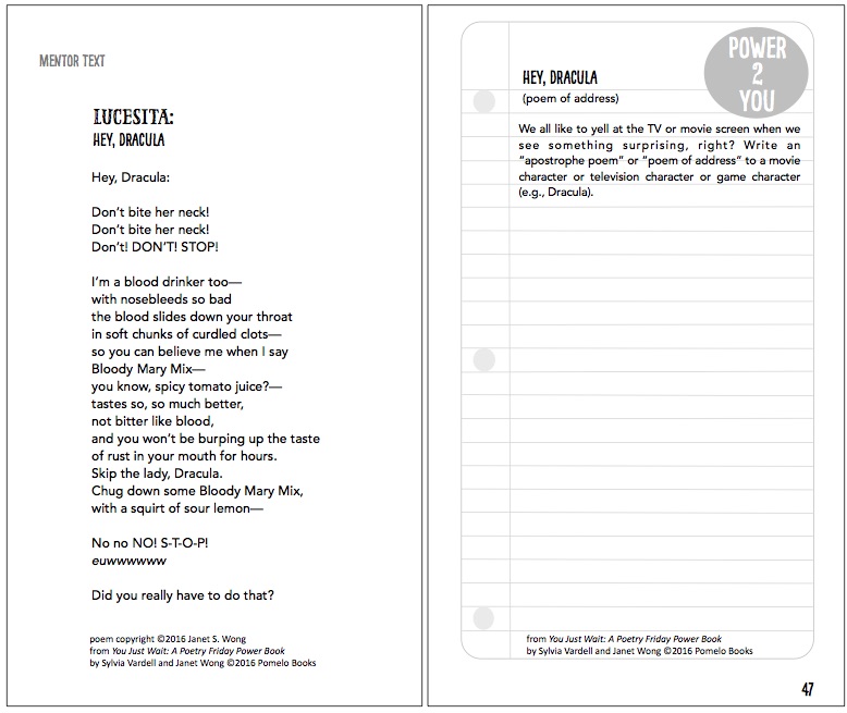 Sylvia Vardell and I are trying to do just that with our newest collaboration, You Just Wait: A Poetry Friday Power Book, published this month by our imprint Pomelo Books. It’s part activity book for tweens and teens; part verse novella; and part writing coach, combined in a way designed to gain the approval of both the school board and your favorite skeptical tween.