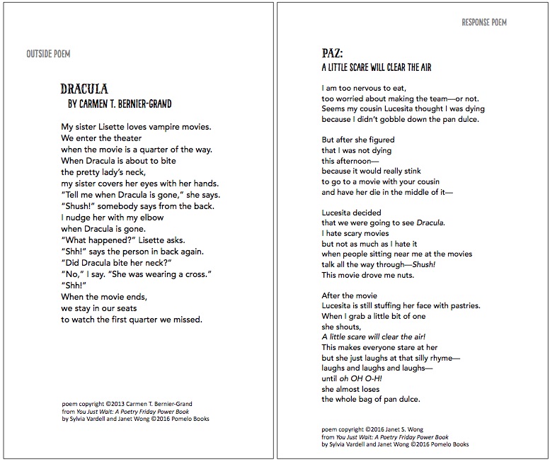 —I imagined how these outside poems could be woven together and wrote two dozen new poems that form a story featuring Paz, an Asian-Latina soccer player, her movie-loving cousin Lucesita, and Joe, Paz’s older brother, who dreams of playing basketball in the NBA. These new poems became “Response Poems” and “Mentor Text” poems as the book evolved.