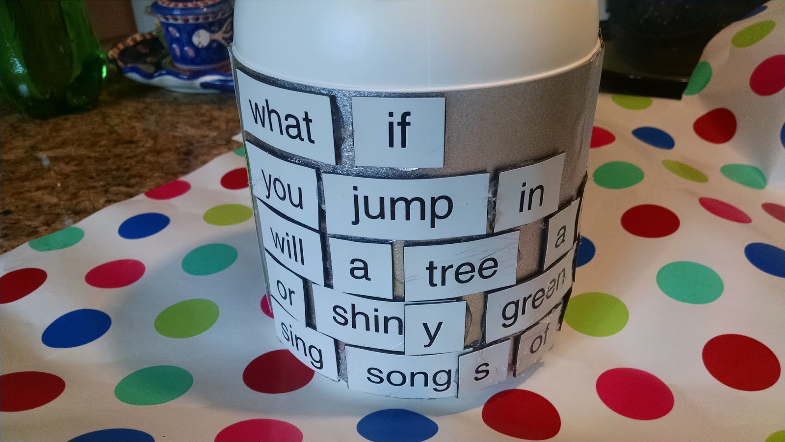 I thought it would be fun to decorate the prompt jar with a poem. Since my own children are too big for our Magnetic Poetry Junior set, I pulled out some tiles, constructed a little poem, and hot-glued it to the jar.