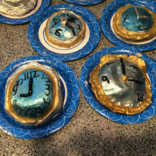 In a recent art class, we looked at the work of Salvador Dali, perhaps most known for his painting titled The Persistence of Memory. Students were instructed to make a “melting clock” from air-dry clay. After observing and talking about the original painting, clocks were sculpted using about two fist size pieces of clay, with the winding mechanism and clock hands added. Numbers were carved into the clock face. After the project dried for a week, the clocks were painted with acrylic craft paint, using similar colors from the original painting.