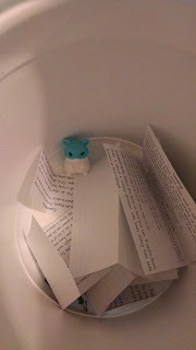 Next, I put some folded up writing prompts inside the jar. However, I also added a few odds and ends: a button with flowers on it, a hamster-shaped eraser, a small wooden turtle. If you’re making a prompt jar for your classroom, consider including a few small objects or magazine clippings for students who are kinesthetic and visual learners.