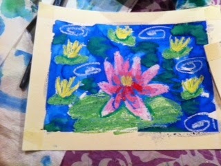For an art exercise, ask children to pick out one specific item to draw or paint from a Monet painting. This can be a single flower or group of flowers, a tree, or even the bridge at Giverny. In the example picture shown here, students were asked to draw one large lily in a pond using light colored oil pastels, (white, yellow, green, pink and light blue) on watercolor paper. Next, students brushed various shades of blue and green watercolor over the oil pastel for a beautiful resist effect.