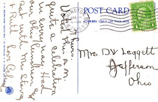 There was a time before Facebook and Flickr when people mailed picture postcards to friends and family as they traveled on vacation. They were often called “penny postcards” because the stamp cost just a penny. Here is one from Washington, D.C. in which the writer - Celinda, my grandmother - tells of voting and attending a luncheon with other Daughters of the American Revolution from Ohio. You’ll also notice that this 1935 postcard bears an address with just a name and a town!