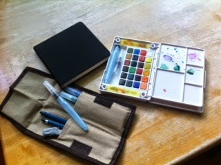 In the photo posted, I’ve organized a simple SketchCrawl kit. An inexpensive drawing pad, pencil, colored pencils and/or markers placed in a small backpack would make a great kit for kids. Regular Crayola markers will dissolve into a watercolor-like paint when brushed over with water. You just need to use a heavier weight paper in your sketchbook.