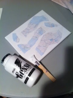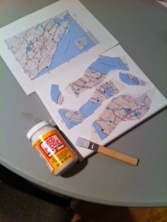 1. Gently tear a portion of the map into interesting shapes. 2. Adhere the map pieces using school glue or Mod Podge onto the canvas, piece of cardboard or heavy weight paper.3. When the glue has dried, brush a light coat of either white acrylic paint or gesso over the map and entire canvas so the map fades into the background. Let the paint or gesso dry.4. Using acrylic, tempera, oil pastels or other drawing media, depict your subject matter of choice on top of the collaged pieces. Remember not to use the paint too heavily-you want some of the map to show underneath your artwork.