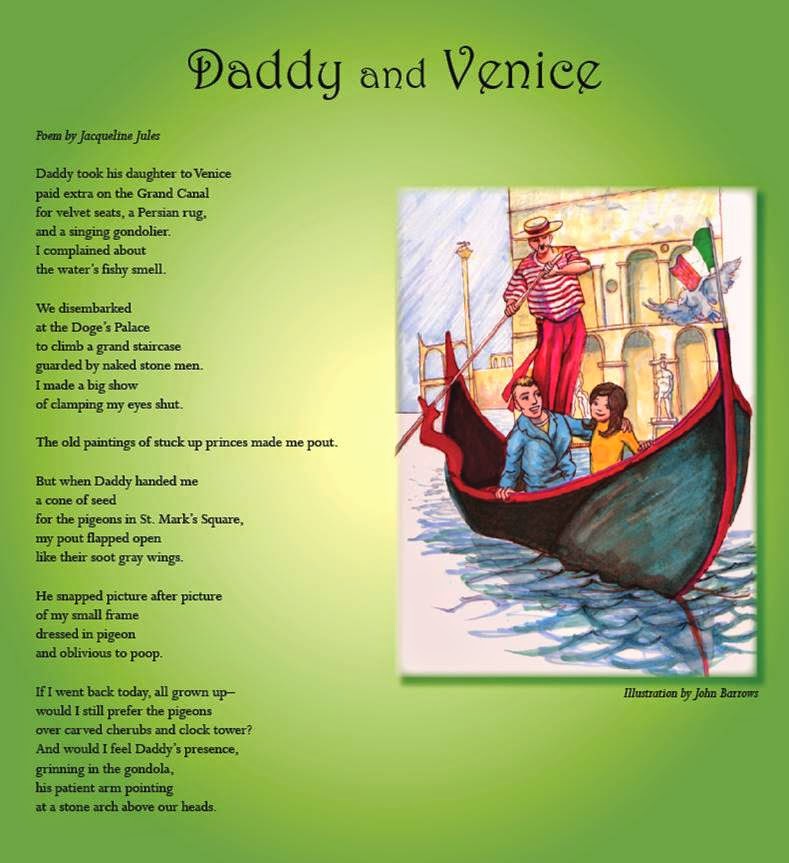So how did I transform a free write which essentially says I don’t remember much beyond the pigeons and my father’s desire to show me the beauty of Venice? My poem makes references to the Doge’s palace, a grand staircase, gondolas with Persian rugs and velvet seats— details I absolutely did not remember from my eight-year-old-experience in Venice. How did I do it? Research! I went to Venice travel sites and used the facts I found to create imagery in my poem.