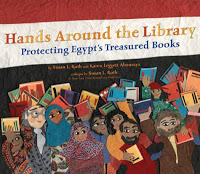 (Dial 2012), an inspiring nonfiction account of people coming together to protect the great library of Alexandria during the 2011 Egyptian revolution. Karen reflects on the joys and challenges of writing and offers a prompt to jumpstart youngsters’ thinking about their own civic engagement. The book’s back matter and Susan’s website www.susanlroth.com include information on the international “Let’s Hold Hands” art project, which encourages children to create and share their own self-portrait collaged paper dolls. This could be a wonderful project for the classroom or home.1. I loved reading about a community acting together to ensure the continuation of a library. It seems that libraries are one of the most important (and cost-effective) ways to foster a love of reading and to ensure the availability of books for everyone. What was your greatest joy in writing Hands Around the Library?
