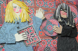 My greatest joy was finding the opportunity to write a compelling story about modern Egypt – and collaborating with a good friend to do it (acclaimed illustrator and collage artist Susan Roth). Children know all about pyramids and mummies and the Sphinx, but we tend to forget that Egypt is full of people living busy and interesting lives today.Here are Karen and Susan in one of Susan’s collage illustrations for the book.