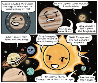 In my new book, Pluto is Peeved: An Ex-Planet Searches for Answers, Pluto seeks answers in a museum. After meeting Earth, some wild-and-crazy germs, a friendly dinosaur, and others, Pluto learns that his change in status is not unique in scientific history. Earth was once considered the center of the solar system. The Apatosaurus was originally named Brontosaurus.