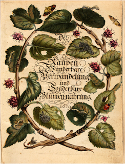 In 1679, at the age of 32, she published a book with a long and fabulous title, typical of the time – The Caterpillars’ Marvelous Transformation and Strange Floral Food. She engraved every print in the book herself and hand-painted many of them, like this title page. You can see her name in the branches at the bottom.