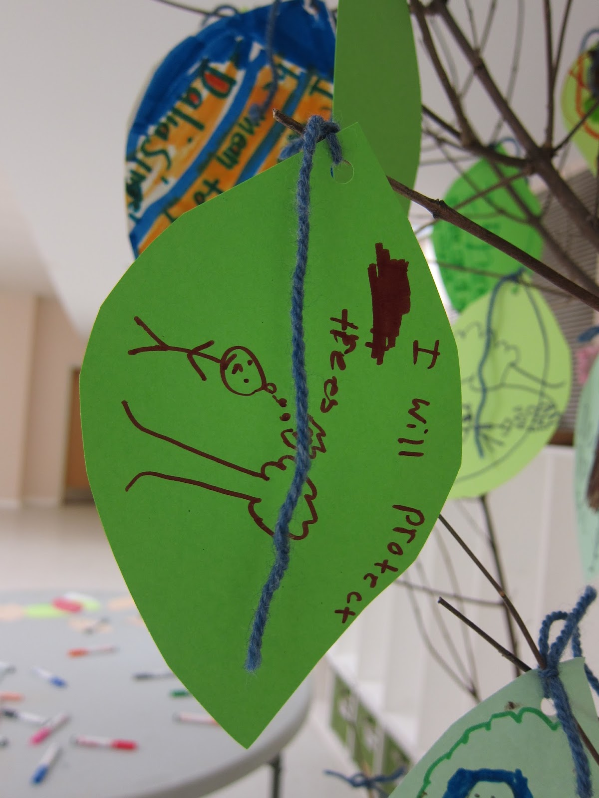A letter to the worldHave the class write a letter to the planet. Maybe it’s an apology note. Maybe it’s a thank you note for a dandelion or a dimpled strawberry or the color green. Again, it’s always great when you can get kids to focus on something specific. Want to get them in the right mood? ? Consider a nature walk around the school for inspiration. Prose or poetry for this one, your pick.A take-care treeIngredients:A tree branch (a fallen one, please =)A hole punchString or yarn“Leaves” cut from recycled paper. It’s fine if there is printing on one side, as long as the other side is blank. Multiple colors help.A flower potRocks or newspapers