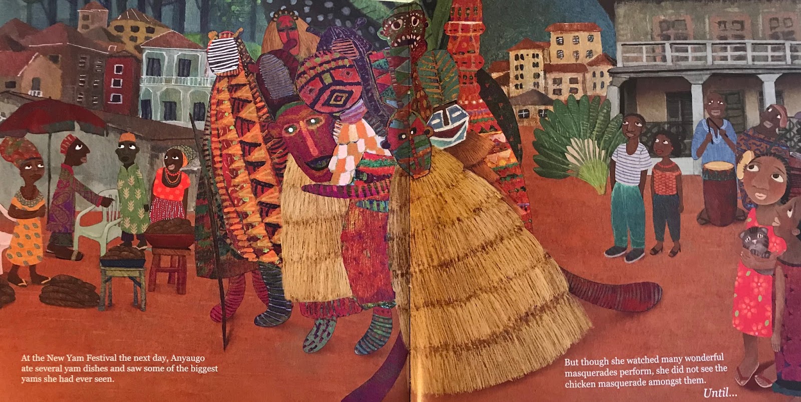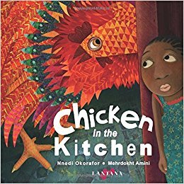 Let’s look at Chicken in the Kitchen, by Nnedi Okorafor, illustrated by Mehrdokht Amini (Lantana Publishing). Okorafor shares the masquerade culture of West Africa through a young Nigerian girl who fears – then adores – the giant chicken in her kitchen.