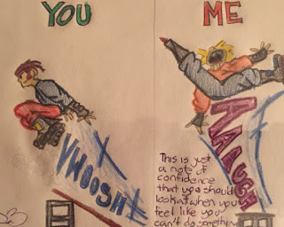 In this picture, a young boy shows that he is not as skilled as his friend on the skateboard but he certainly showed what a wonderful artist he is! Everybody is smart in different ways.
