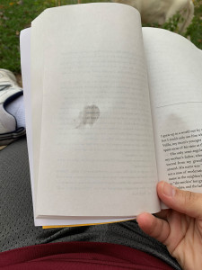 So now that the book is permanently stained, I shove Koda away, and I’m going inside because this is the most disgusting thing that can happen on a New Year’s Eve. But, being a person who loves his wife and appreciates paper, I don’t just toss the book aside. I’ve got to fix this! I’m now fanning the pages. Who wants to read that’s had butt juice absorbed through Chapter 10 and 11? Sacrilege!