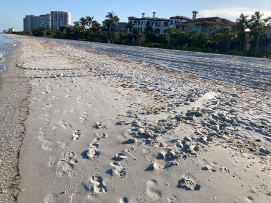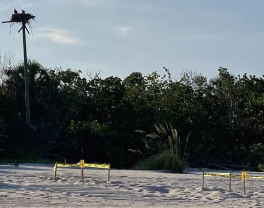 Some of you might know that this is turtle nesting season here in Florida---one of my favorite times of the year. Our first nest was found on April 28, about two weeks earlier than last year. As of this week, we were up to 116 nests. What I'm showing above is something called a "false crawl"...well, three false crawls. A false crawl occurs when the mother comes to nest but doesn't. What was so interesting about the above is that there are 3 of these, relatively close to each other---something I've never seen. Whether this was by one mother or 3, we don't know, but I think of this as showing the persistence of one mother...and these mothers weigh something like 250-300 pounds. Imagine dragging oneself up the beach carrying all that! And I've yet to see nests close to each other that were made on the same night. Nesting seems to be a solitary operation.