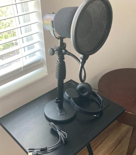 My next undertaking is learning how to do my own audiobooks. From everything I've learned so far, it's a very time-consuming process. The preparation. The actual recording which involves about 5 hours between recording and editing for every 1 hour of the audiobook. This time-intensive demand makes hiring a professional narrator out of reach for most indie authors. The development of more user-friendly software and less costly equipment has made the process supposedly more accessible for authors. We'll see... Below is a picture of my recording set-up minus the computer: the microphone and stand, something called a pop filter and headphones. It's pretty compact as I will likely record in a closet once I get the process down--that helps eliminate any background noise when not in a studio.