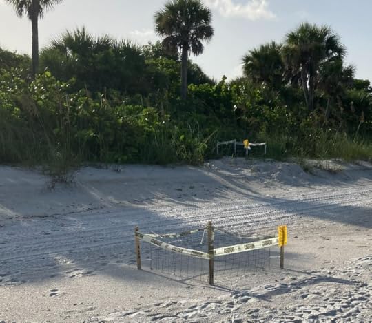 There is no autumn on the gulf coast, such as there is in other parts of the country—no chill in the October air, no crunch of the dry, falling leaves—but here I know it’s October by the disappearance of the many scattered, protective turtle egg cages. I’ve learned a number of things about sea turtles over the past months: that they will return to that beach where they were hatched; that most will weigh between 300 and 400 pounds; that their footprints coming up and down the beach look like someone had worn a too-large boot on each hand and each foot and then trudged up and back down the dune, away from the high tide mark; that the season runs from April to October and that there are usually between 50 and 100 eggs in a nest; that the hatched eggs look like deflated ping pong balls; that the primary predator is the armadillo; and finally, that the eggs don’t always hatch at night, but rather when the temperatures have cooled.