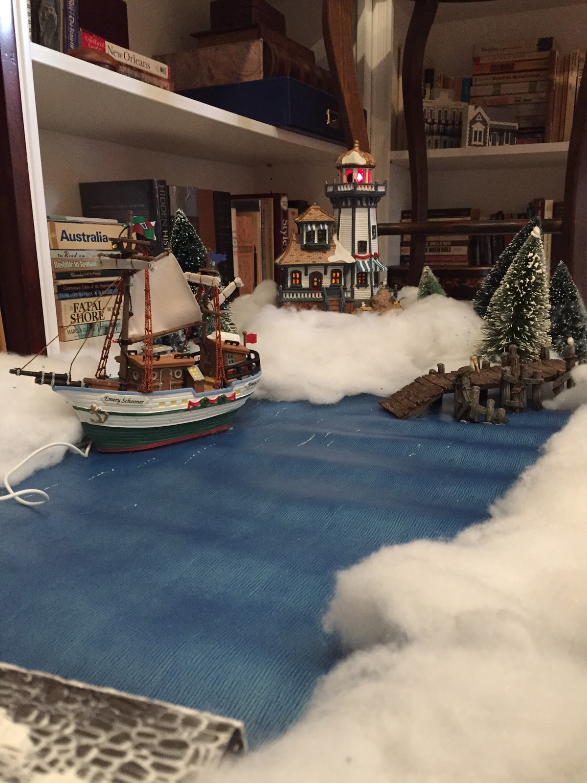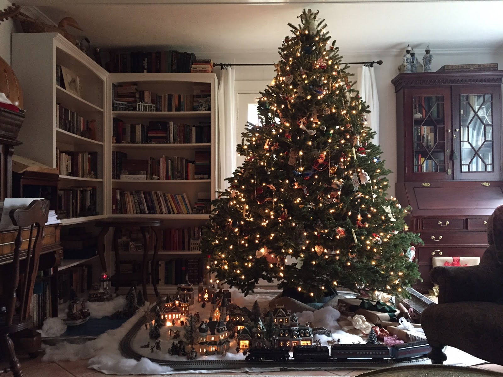 Huckleberry always loved the tree and village so much that I must admit it was hard putting it up without his help. BUT, my little Peanut is still on the mend, and while I can't completely relax, I think she is going to make it. And my son-in-law, while still so terribly ill, was able to make it here for Christmas, so we are thankful for that. And Steve is now walking well enough that he was able to put up the crown molding in Danielle's room (that was the one room in the house that didn't have it).