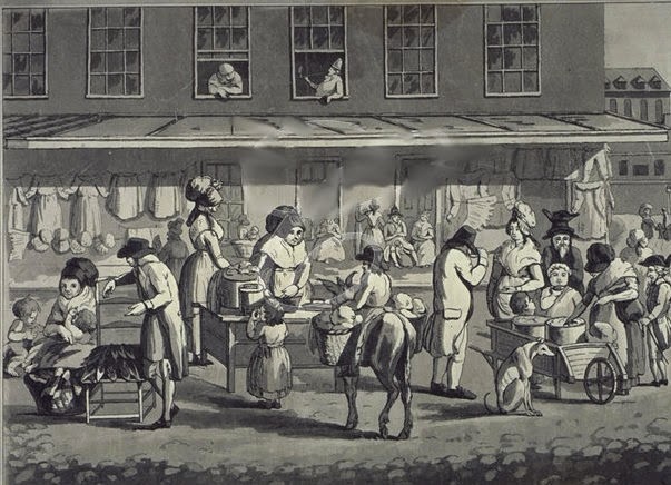Traditionally, many old clothes dealers were Jewish. Look closely at Rowlandson's watercolor above (you can click on it to see a larger image) and you can read the names on the shop signs. Moses Moncera Old Hats and Wigs. Widow Levy Dealer in Old Breeches. You'll also see how many of the dealers are shown wearing long coats and beards (the piles of hats they wear on their heads are a sign of their trade). As a result, most of the stalls and shops were closed on Saturdays until after sundown. The lane did a roaring business on Sunday mornings.